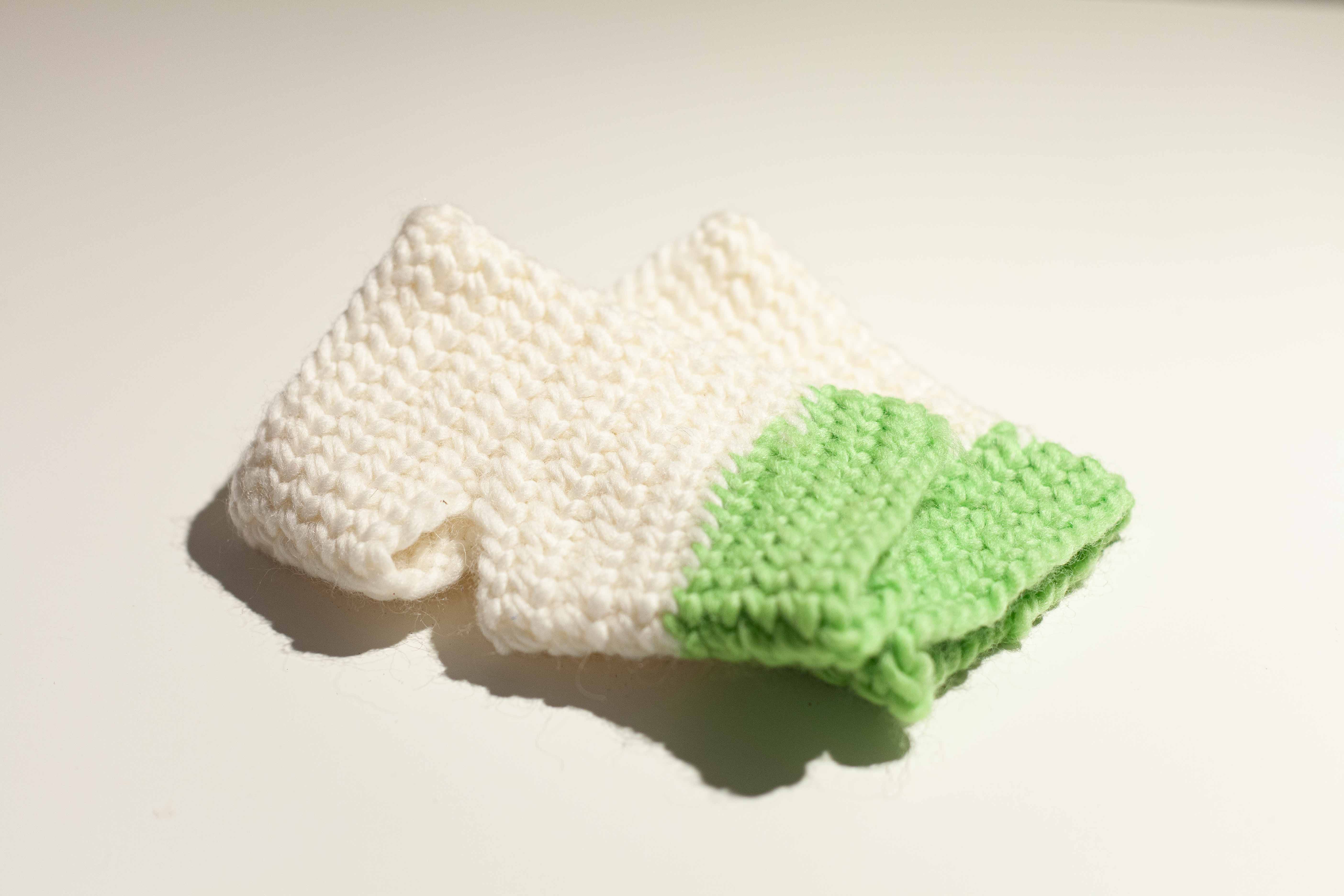 Die Pulswärmer sind aus weißer Wolle gefertigt und am Handgelenkt mit einem hellgrünen Garn abgesetzt.