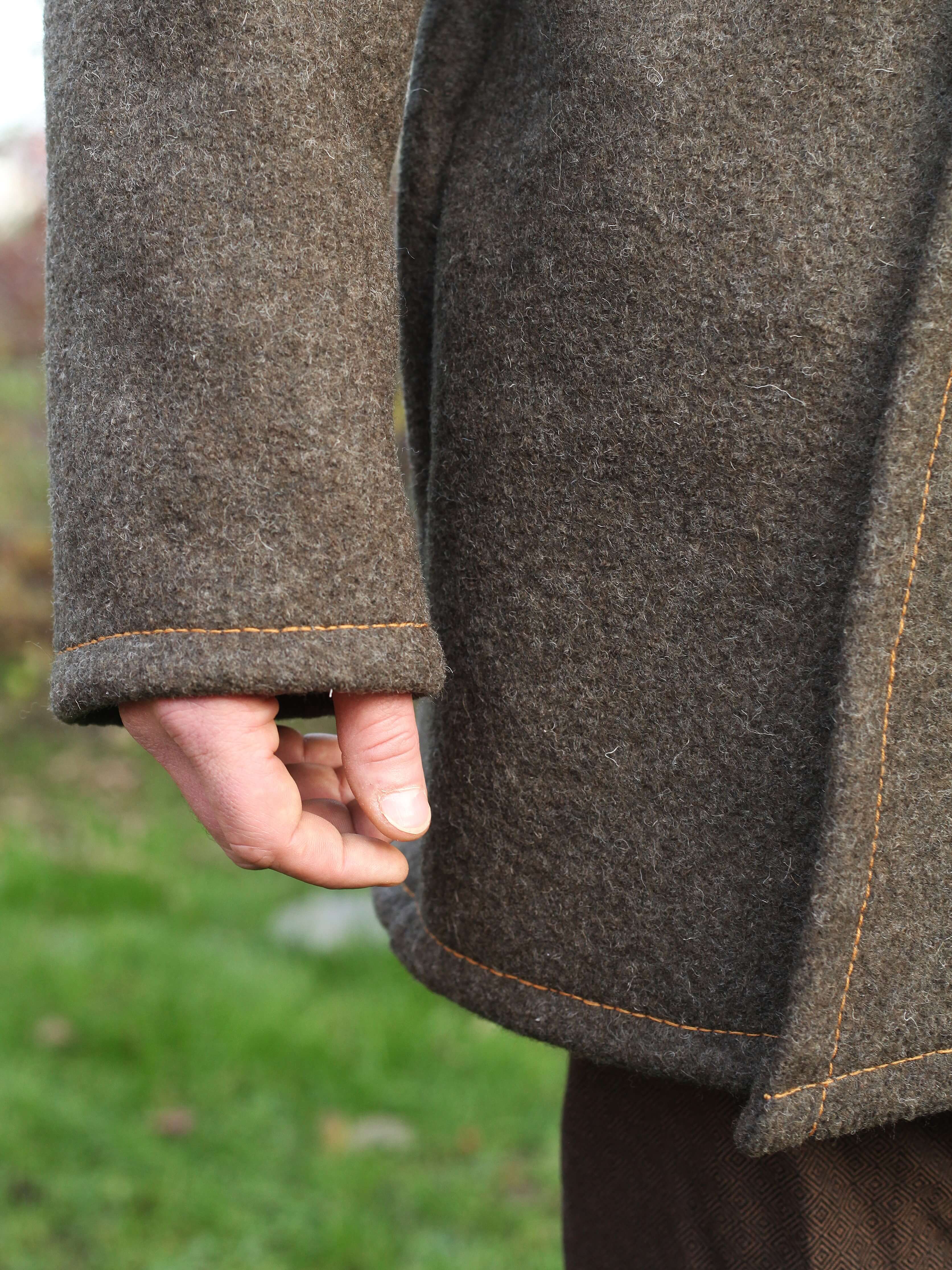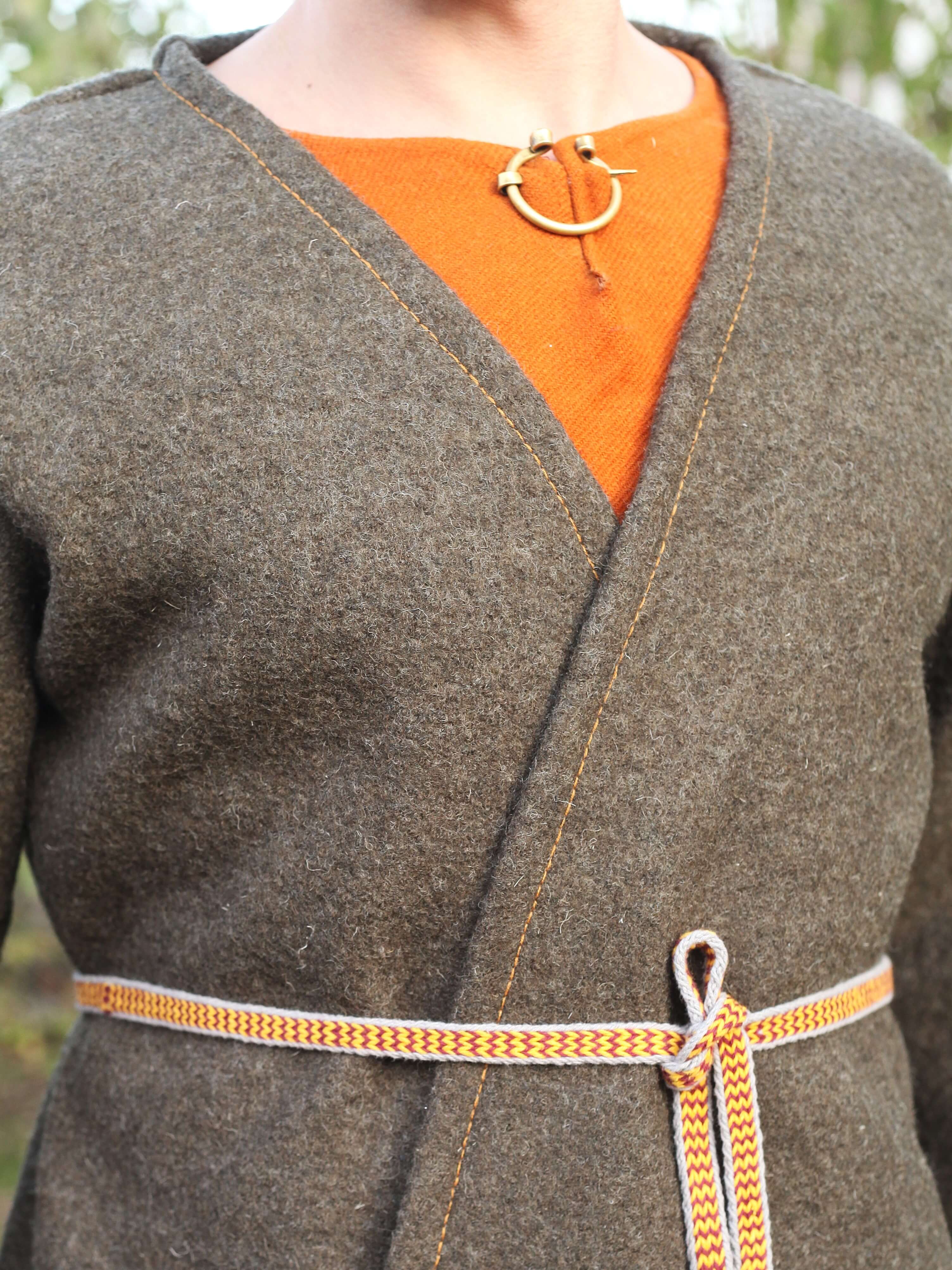 Er ist aus einem weichen und warmen Wollstoff mit 100% Wollanteil genäht. Die Nähte sind mit der Maschine genäht und alle Ränder mit einem Wollgarn von Hand versäubert. Die beiden Vorderen Teile werden einfach übereinander geklappt und mit einem Gürtel oder einer Borte verschlossen. Eine Borte ist im Lieferumfang nicht enthalten und kann zusätzlich erworben werden.