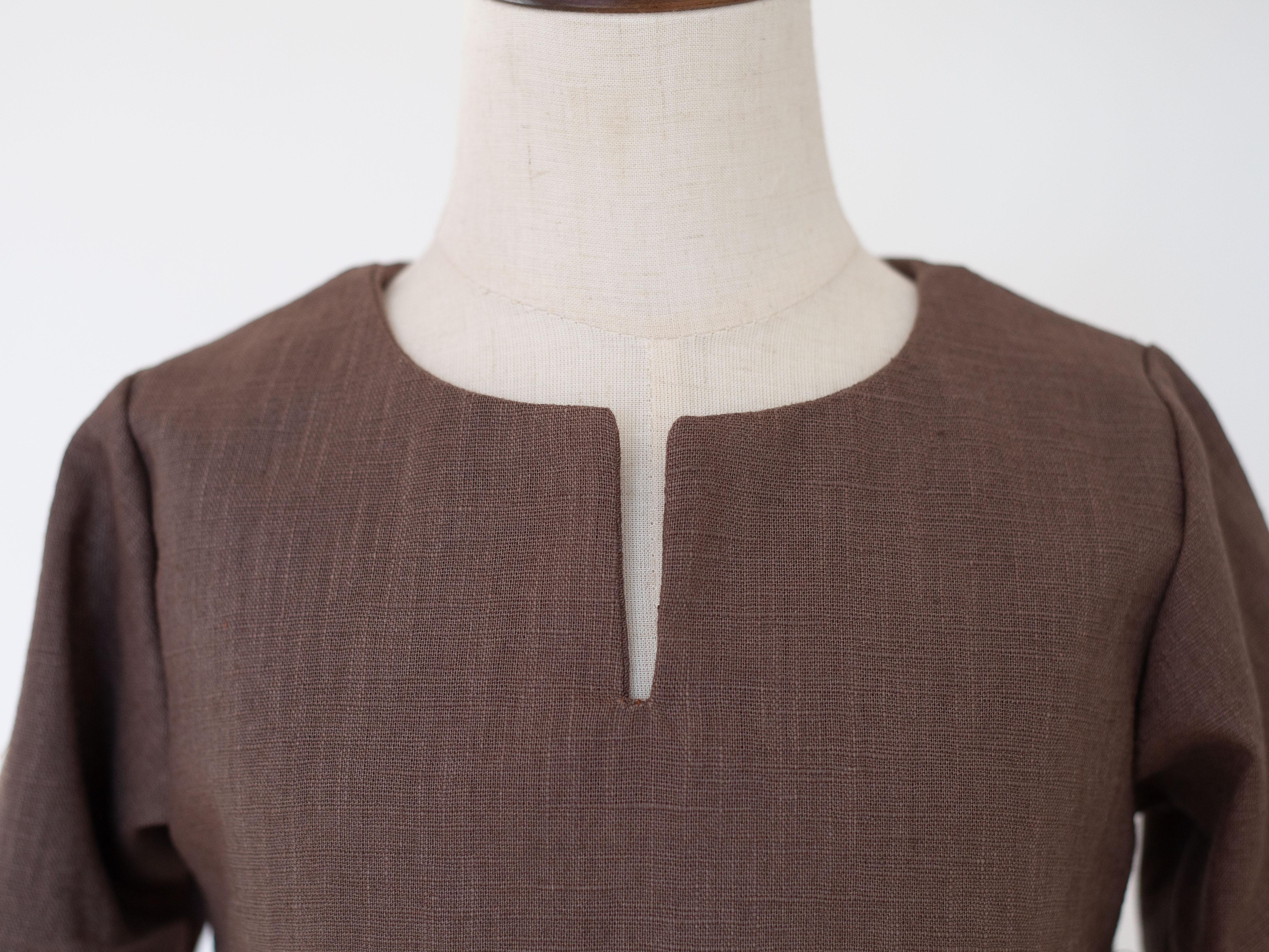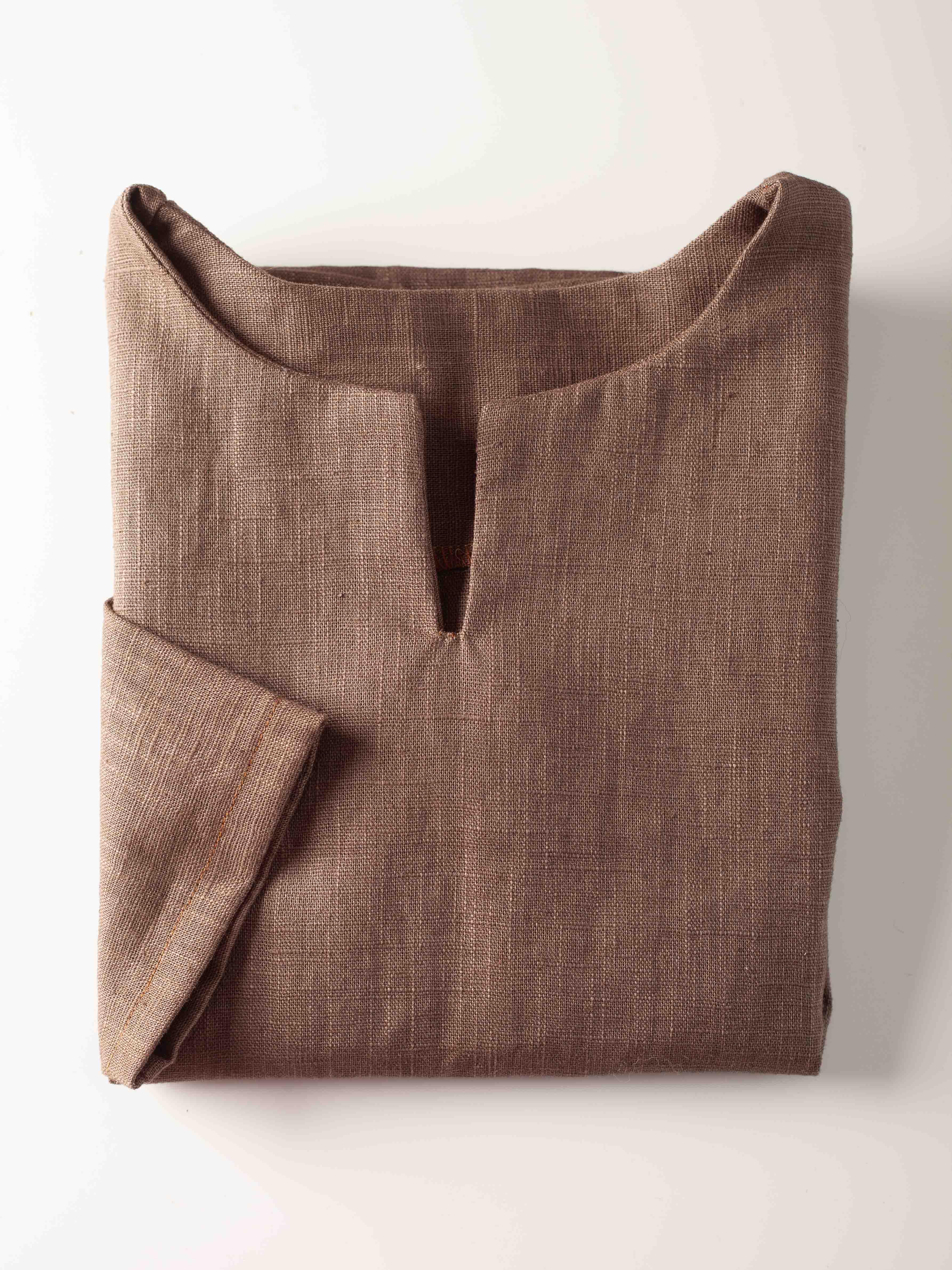 Eine einfache Tunika aus braunem Leinenstoff für kleine Wikinger und die, die es werden wollen. Die Leinentunika ist mit der Maschine genäht. Sie hat am Halsausschnitt einen Schlitz wie es im Frühmittelalter häufig zu sehen ist. Durch die seitlich eingesetzten Keile sitzt die Tunika locker und gibt genügend Bewegungsfreiheit, damit sich ein Kleinkind darin wohl fühlen und frei spielen kann.Kann bei 30 Grad in der Maschine gewaschen werden.