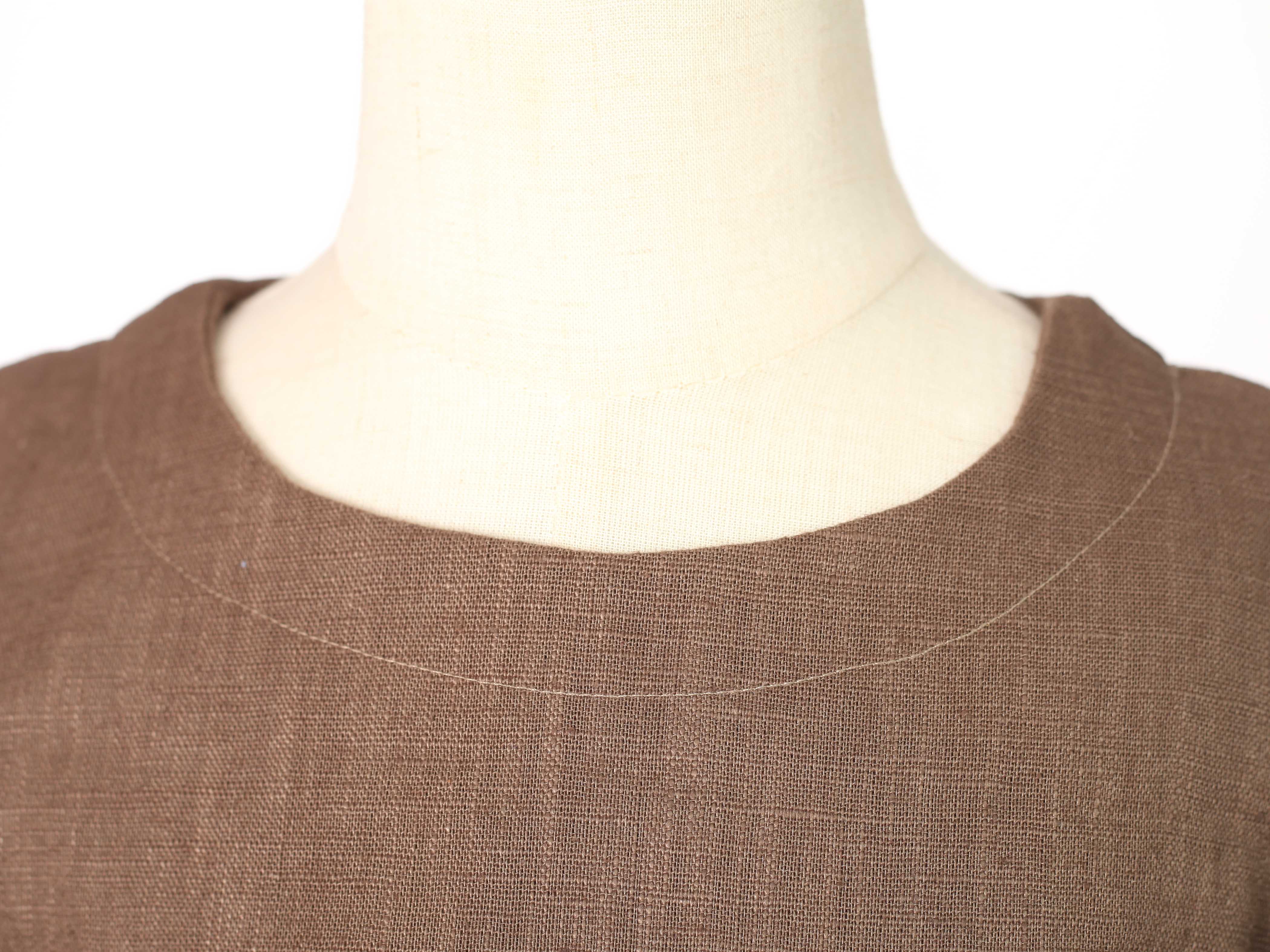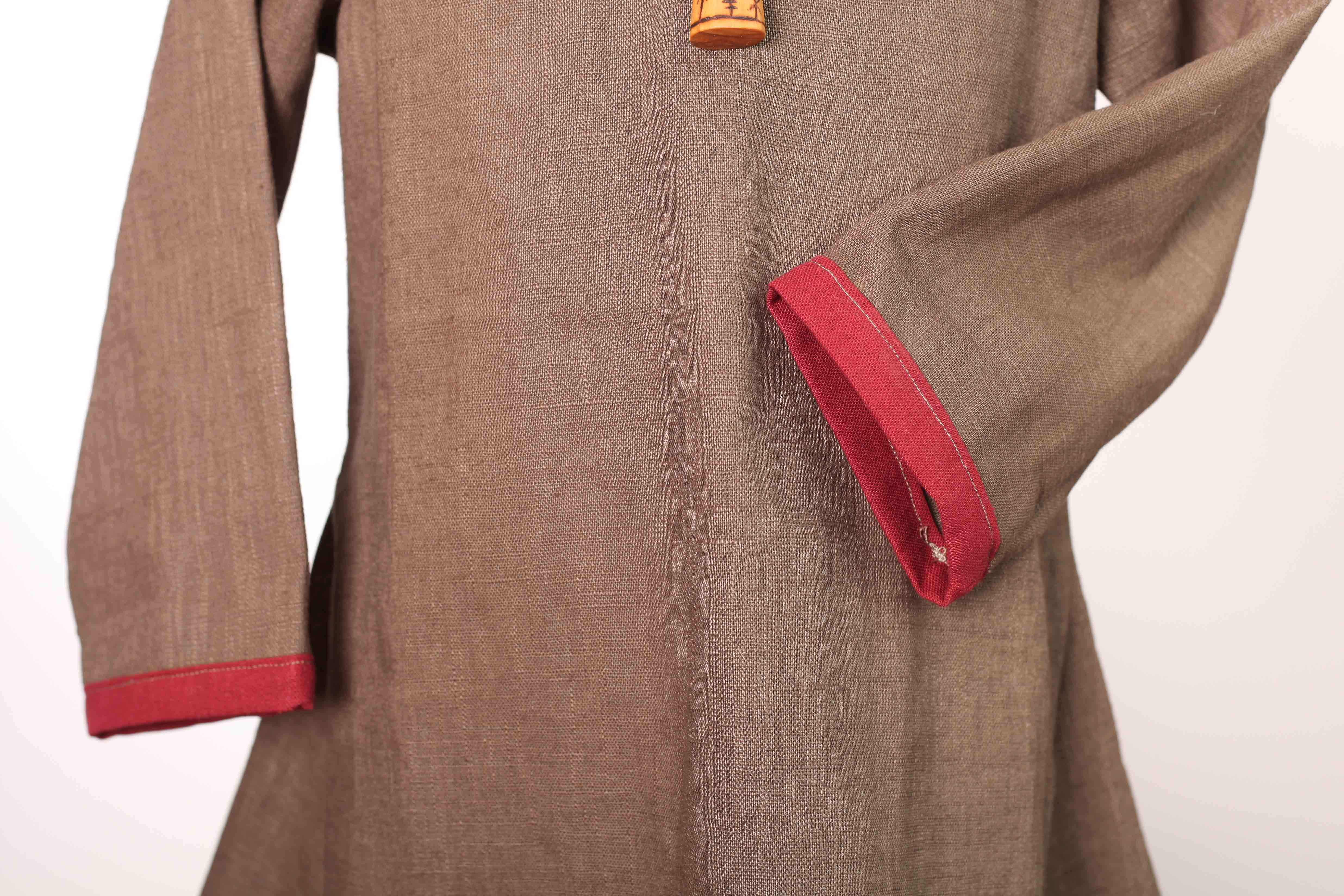 Das Kleid ist aus einem dunkelbraunen Leinenstoff genäht und hat an den Ärmeln einen roten Besatz von ca 2 cm.