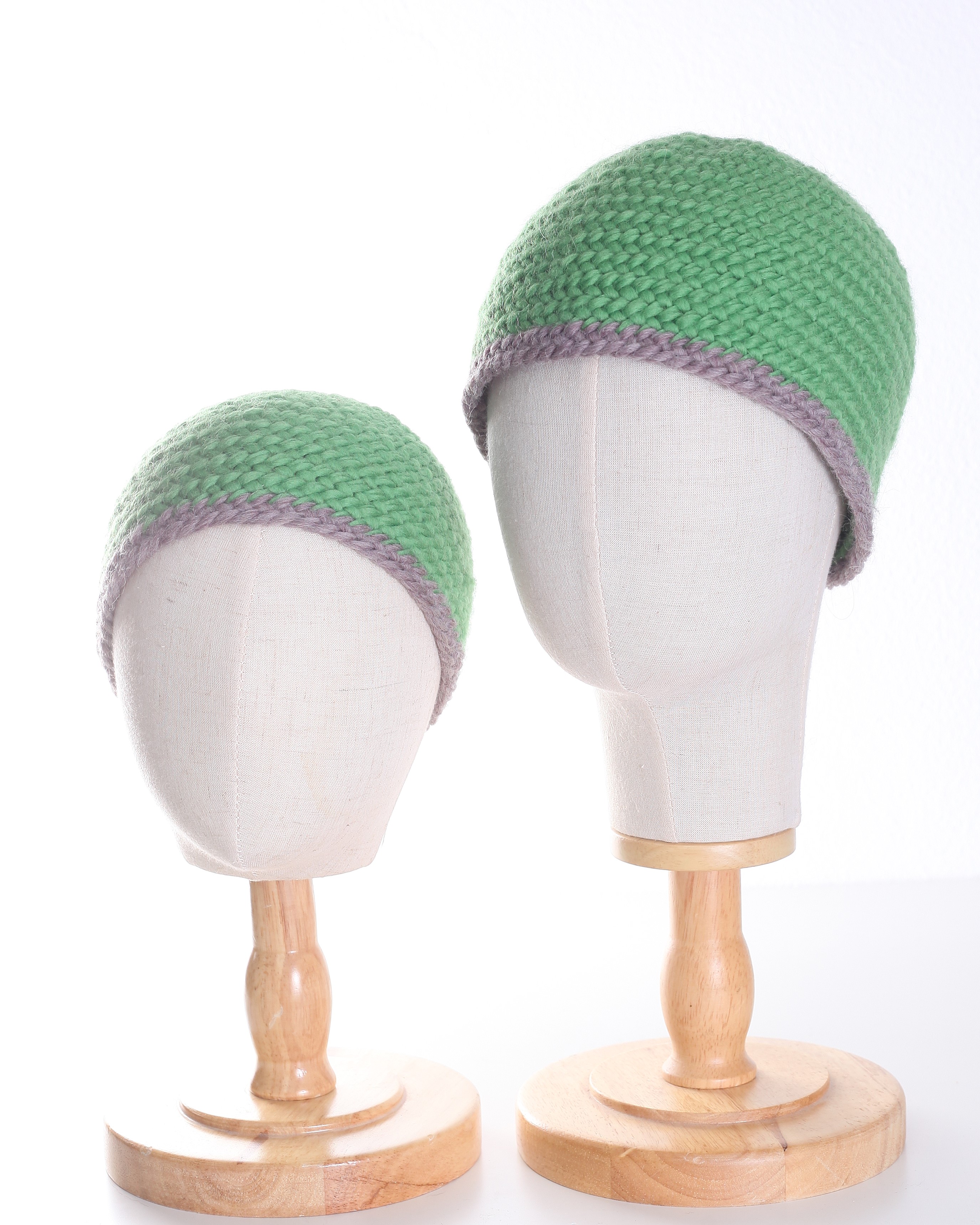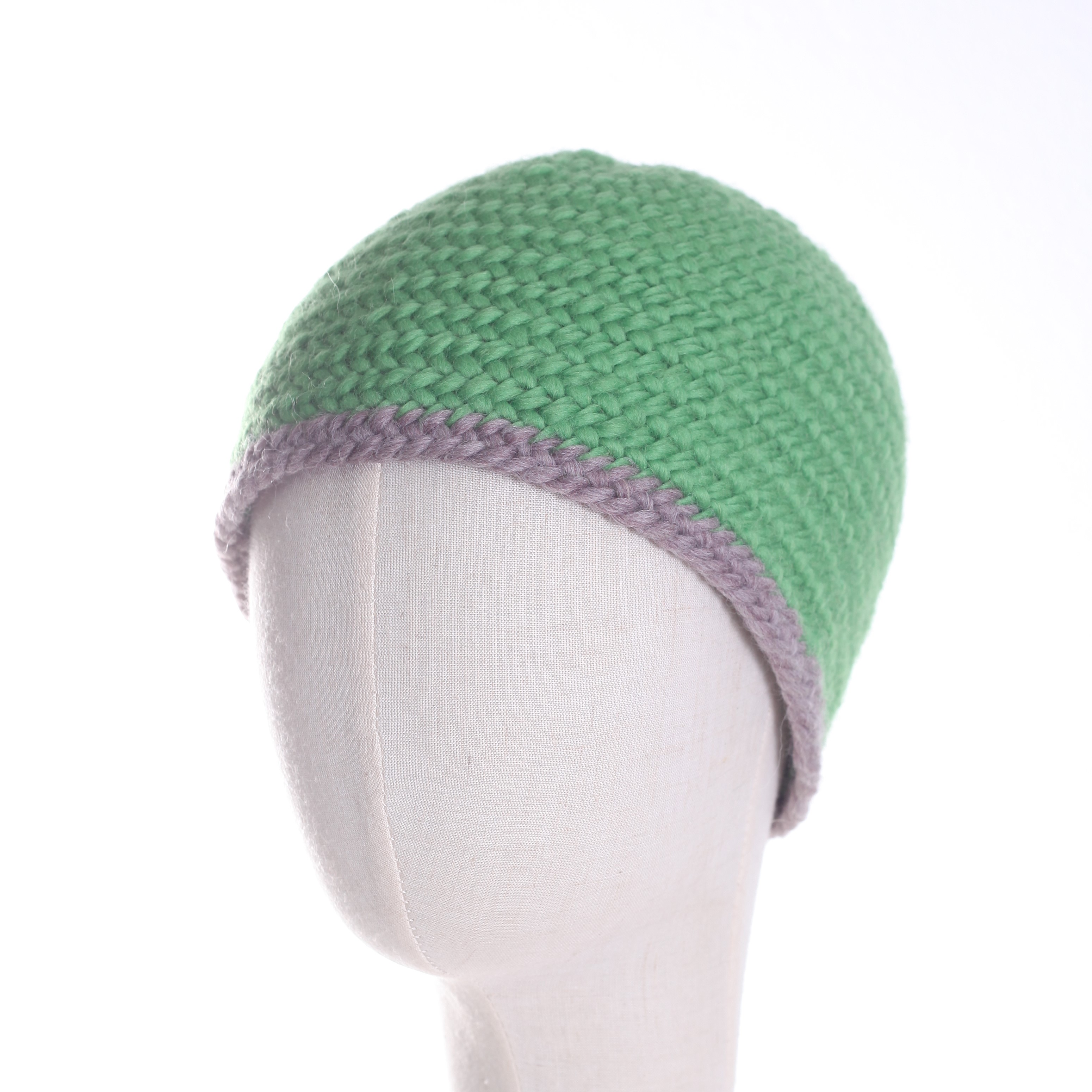 Eine Mütze nadelgebunden im Oslostich. Sie ist aus hellgrüner Schurwolle von Hand hergestellt.