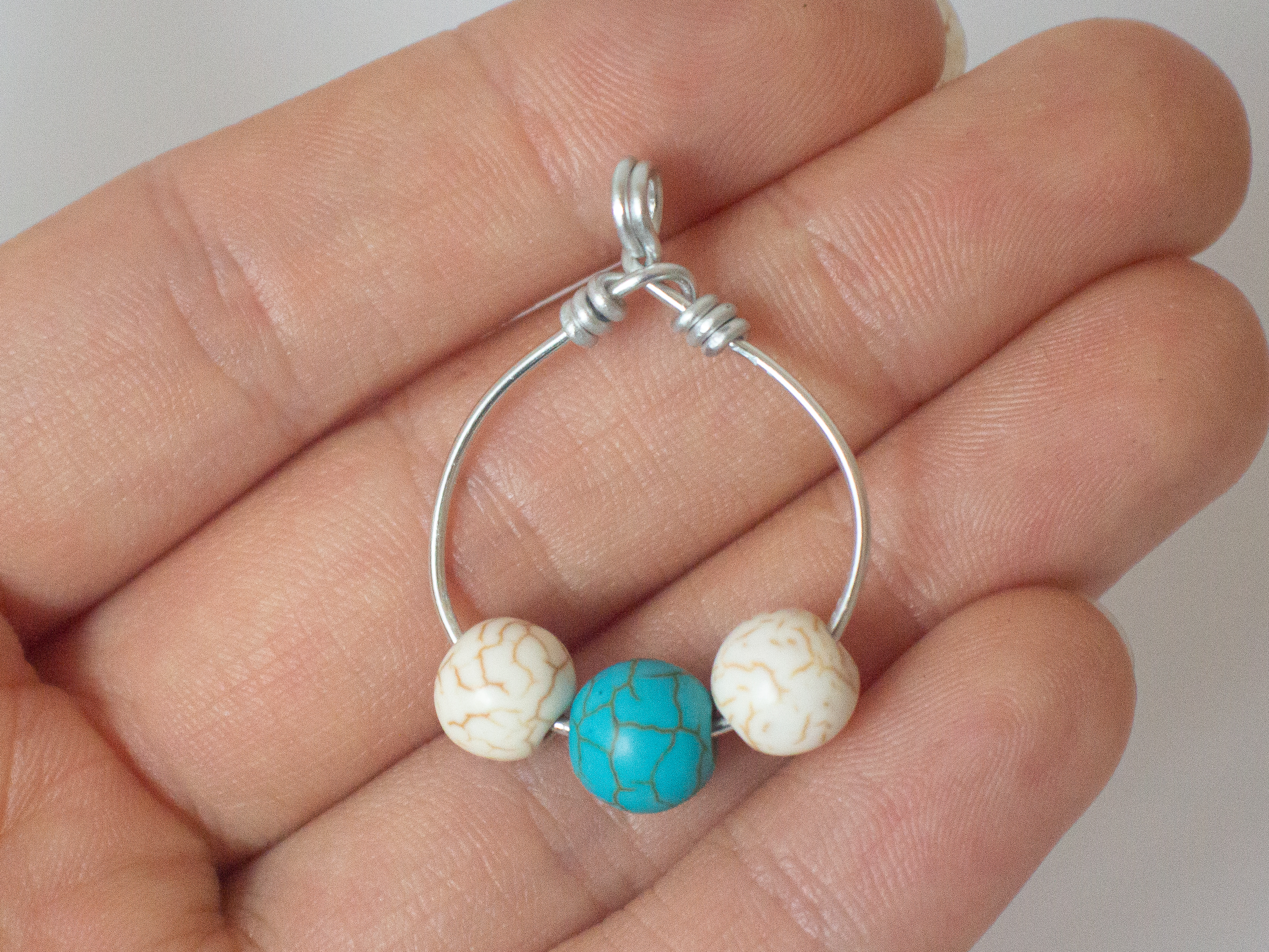 Dieser schöne Anhänger ist aus silbernem Aluminiumdraht mit 3 sehr schönen Perlen mit crack-optik gefertigt und hat eine insgesamte Länge von 3,4 cm und eine Breite von 2,5 cm. Die Perlen sind in den Farben Türkis und weiß zusammengestellt.