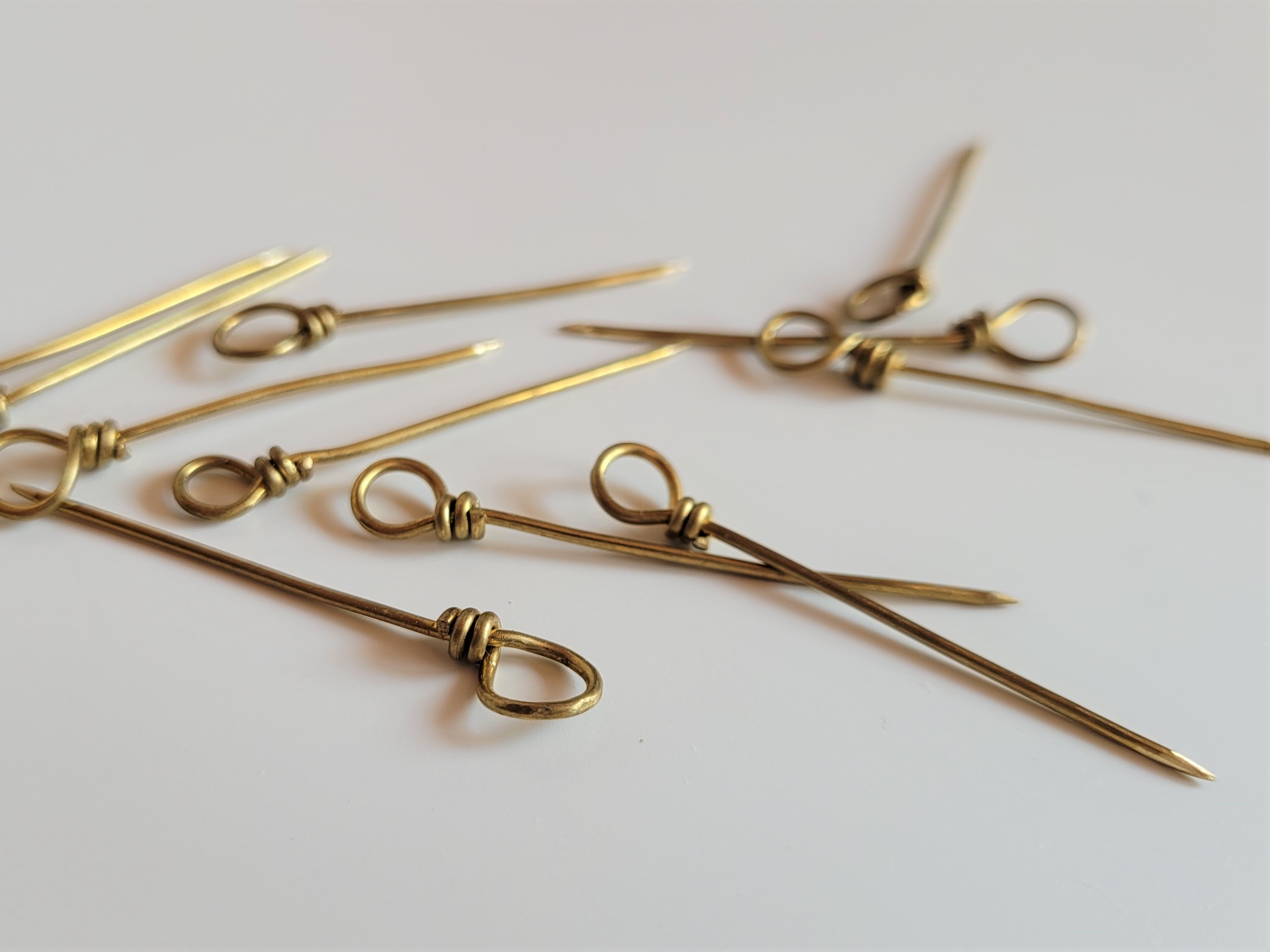 Diese sind aus Messing gefertigt. Jede einzelne ist von Hand gefertigt und geschliffen. Sie können zum feststecken von Stoffen beim Nähen verwendet werden oder auch für die Befestigung von Kopftüchern.