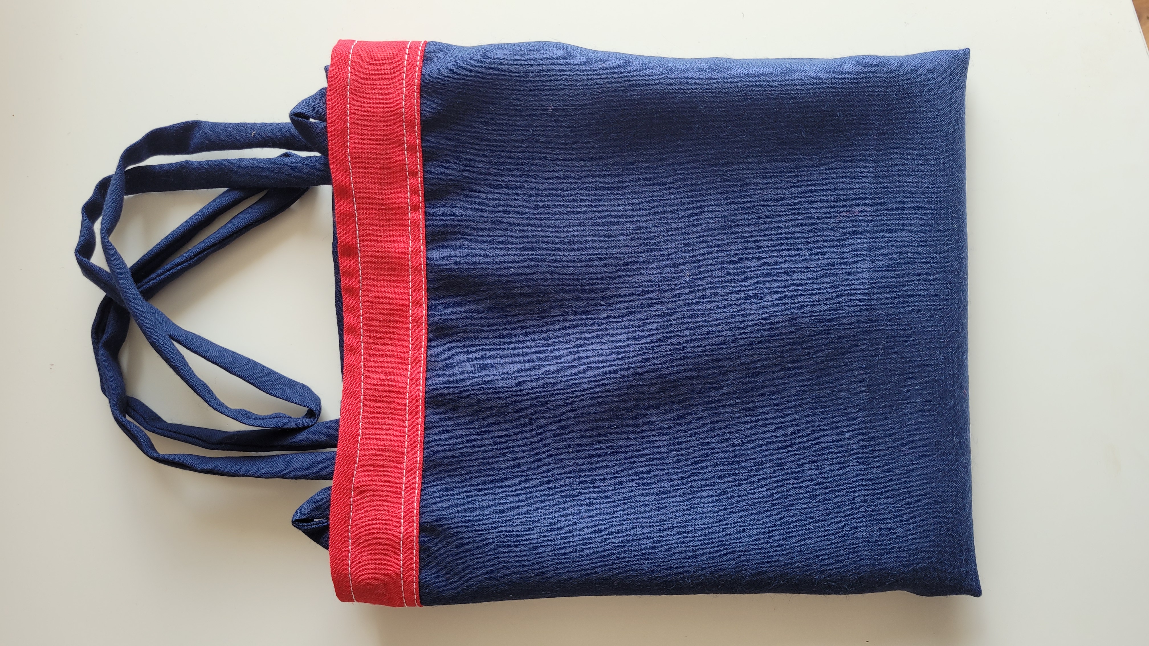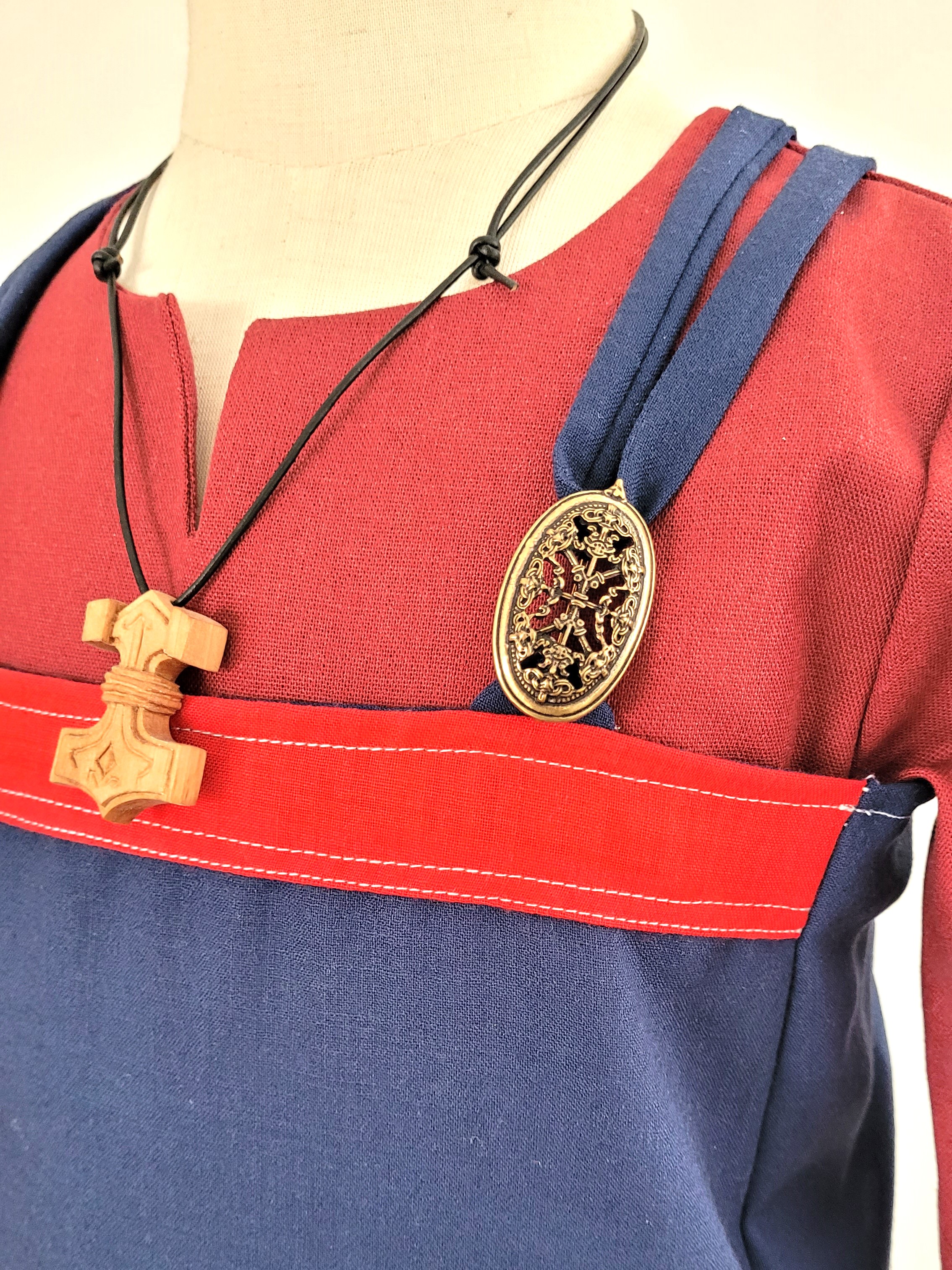 Der Trägerrock ist aus einem sehr leichten dunkelblauen Wolltuch genäht. Auf der Vorderseite ist ein Besatz aus rotem Wolltuch angenäht. Alle Nähte sind mit der Maschine genäht. Die Träger sind wikingertypische Schlaufen, die mit Hilfe von Fibeln gehalten werden.