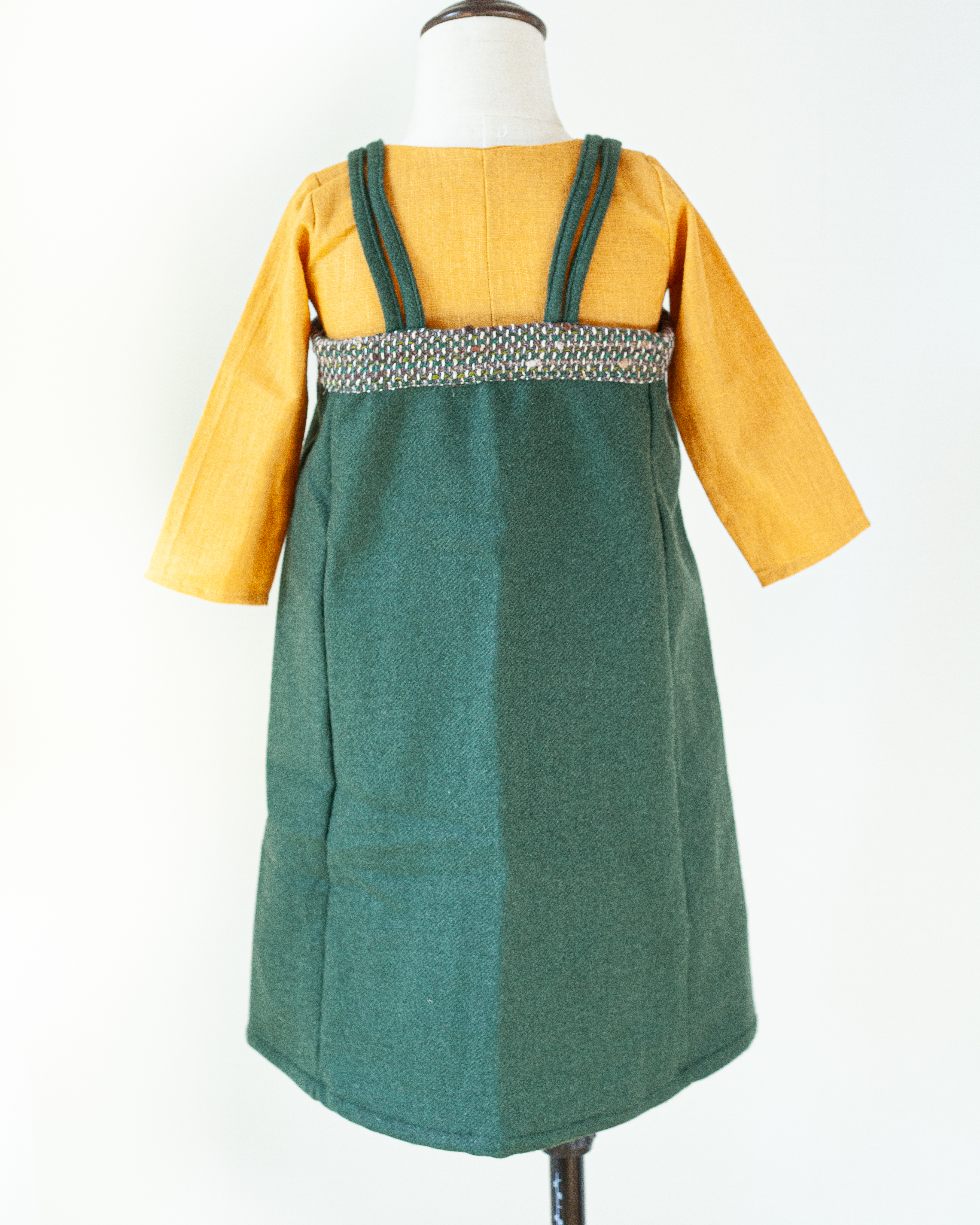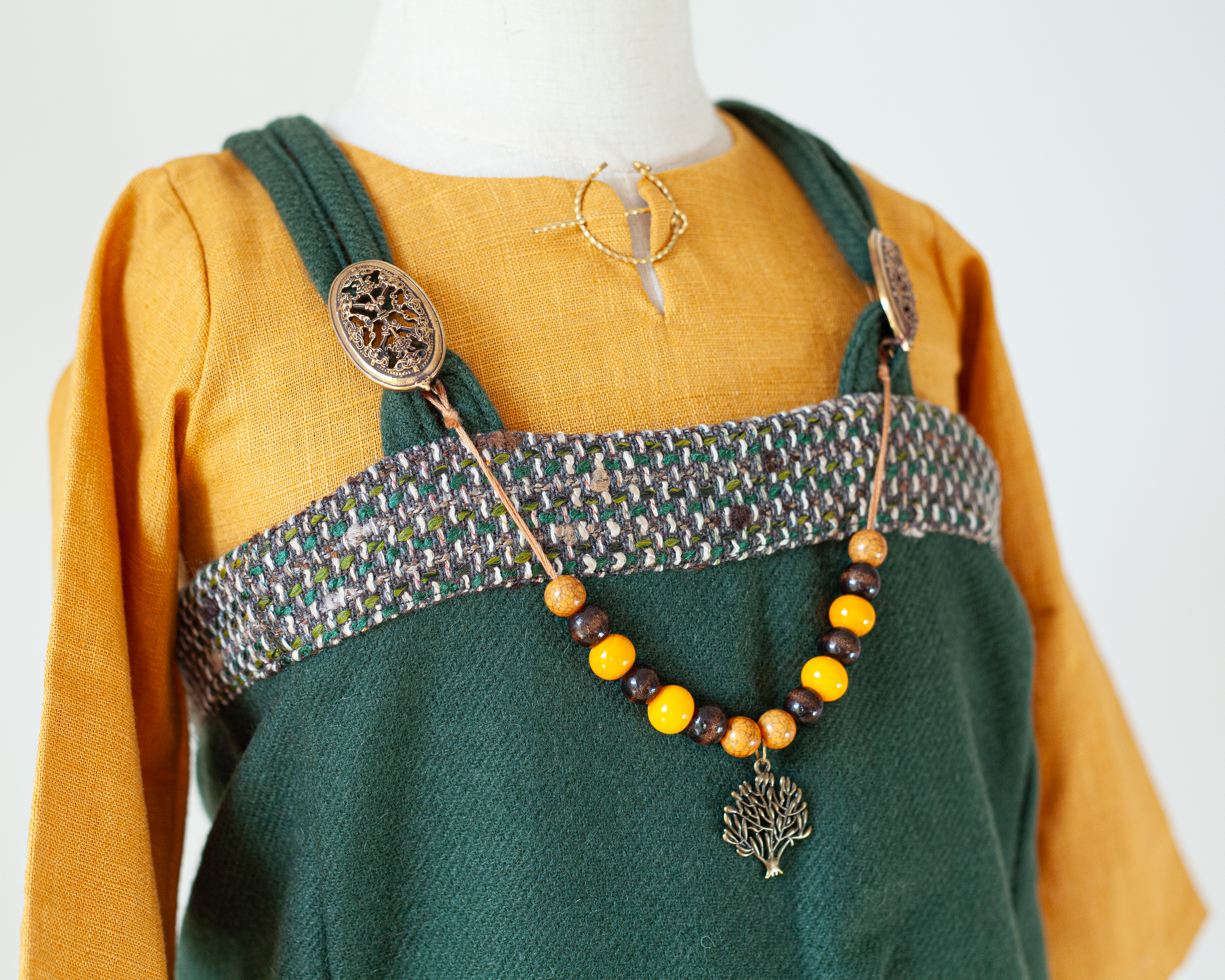 Hübscher Trägerrock aus weichem und warmen Wollstoff in dunkelgrün für kleine Wikinger Mädchen. Er hat den typischen Schnitt bestehend aus 4 Teilen und den Schlaufenträgern die mittels Fibeln oder Knoten verschlossen werden können.