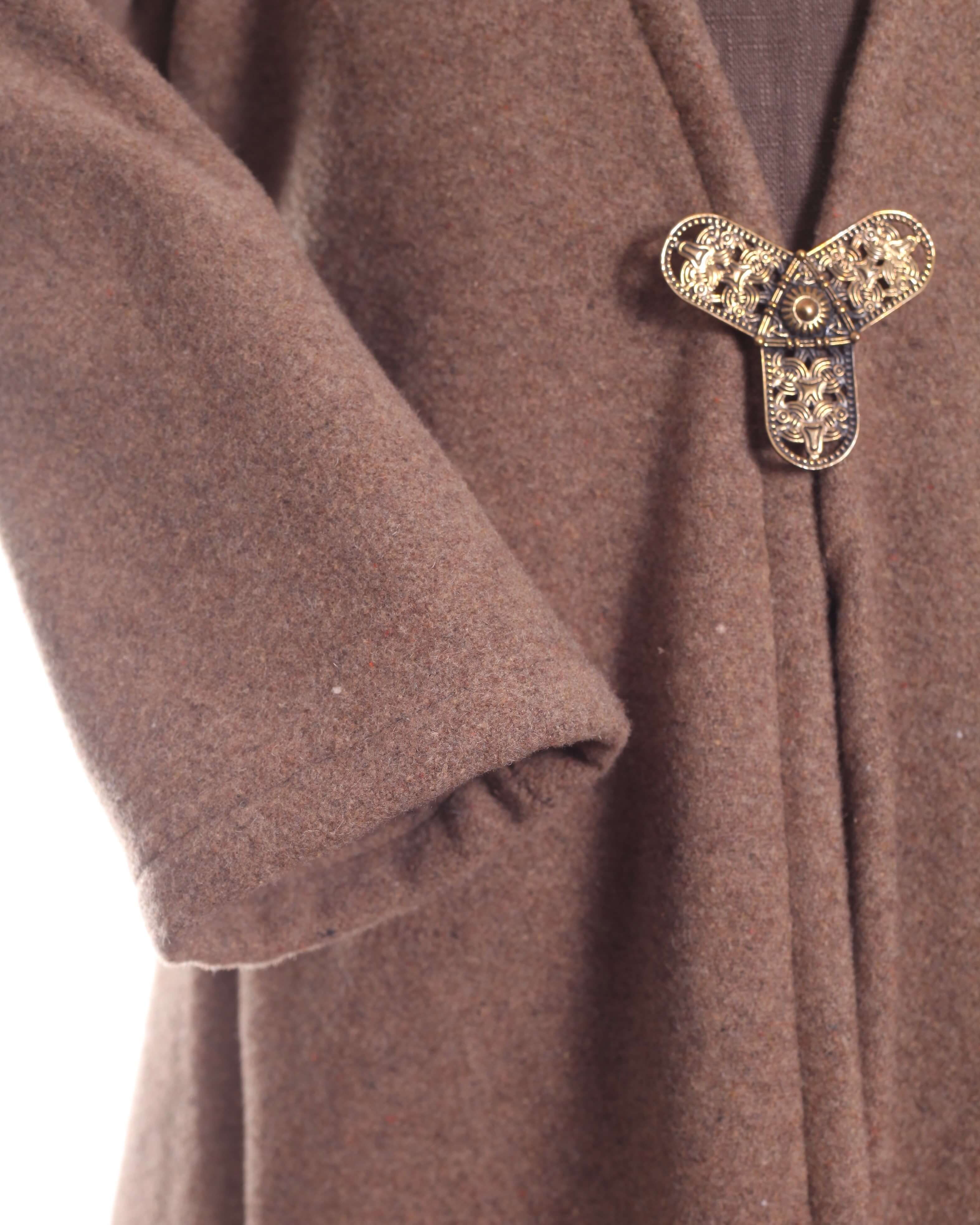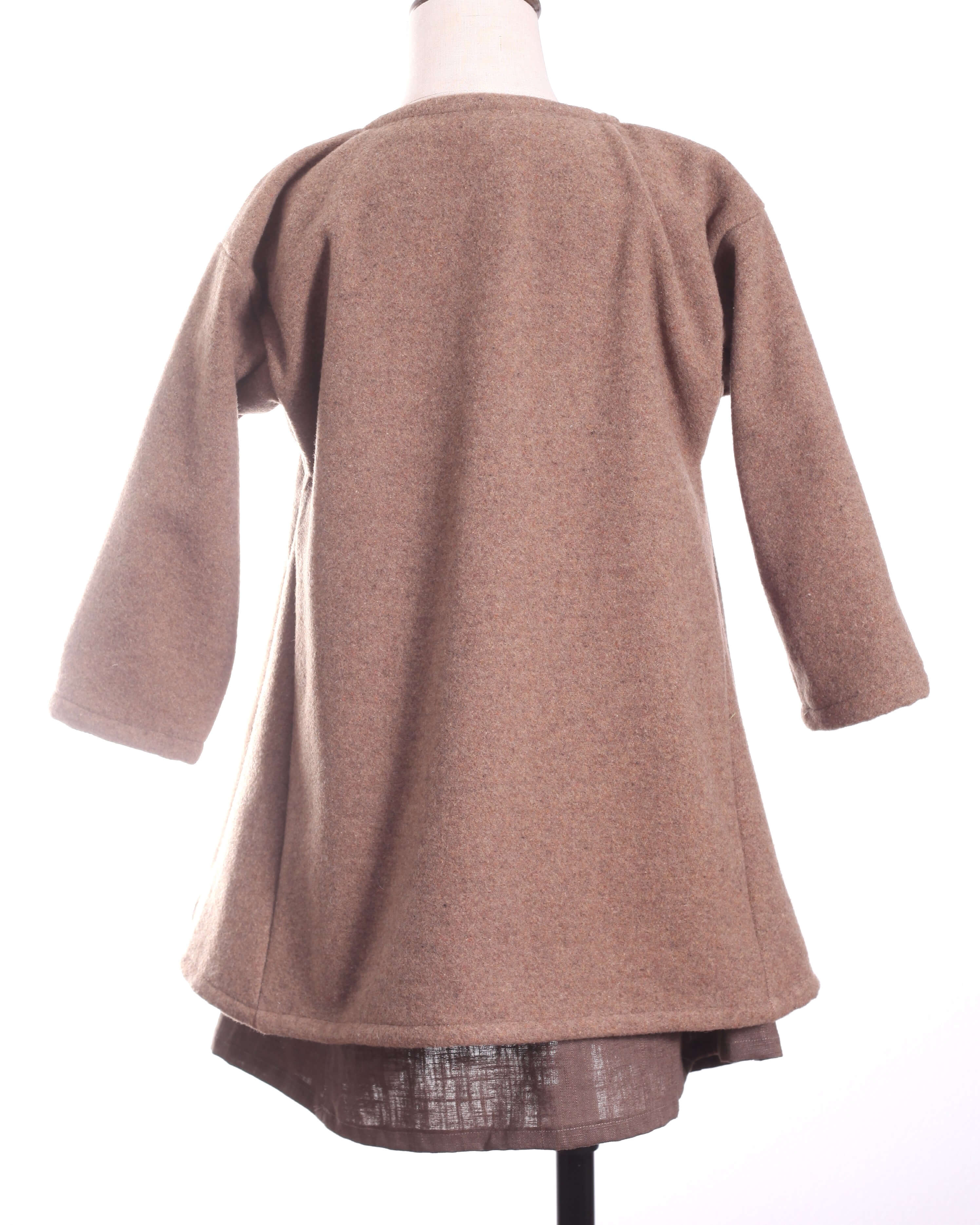 Ein schöner und warmer Wollmantel nach wikingerzeitlichem Schnitt. Der Mantel ist aus einem weichen brauen Wollstoff maschinengenäht. Er passt sehr gut bei Größe 110. Der Mantel kann vorne überlappen oder aneinandergelegt getragen werden. Verschlossen wird er mit einer Fibel oder Borte (nicht im Lieferumfang enthalten).