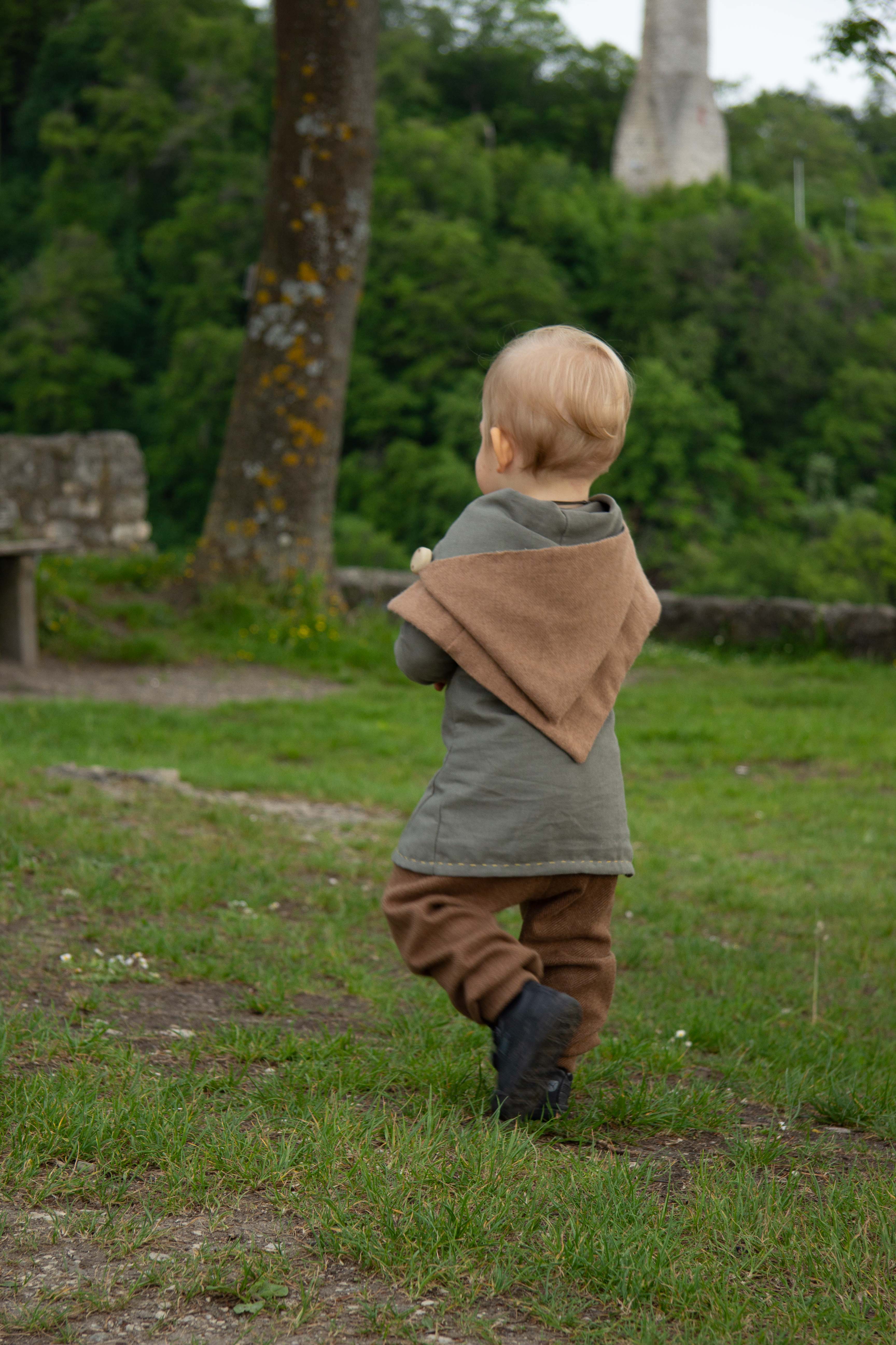 Neben den Gewandungen habe ich also auch normale Kleidung dabei wie zb Strumpfhosen oder Jogginghosen (ohne Aufdrucke oder Schnick-Schnack), die er alternativ unter die Tunika anziehen kann. Genauso wie die Matschhose und Gummistiefel. Ohja, die waren schon häufiger im Einsatz.